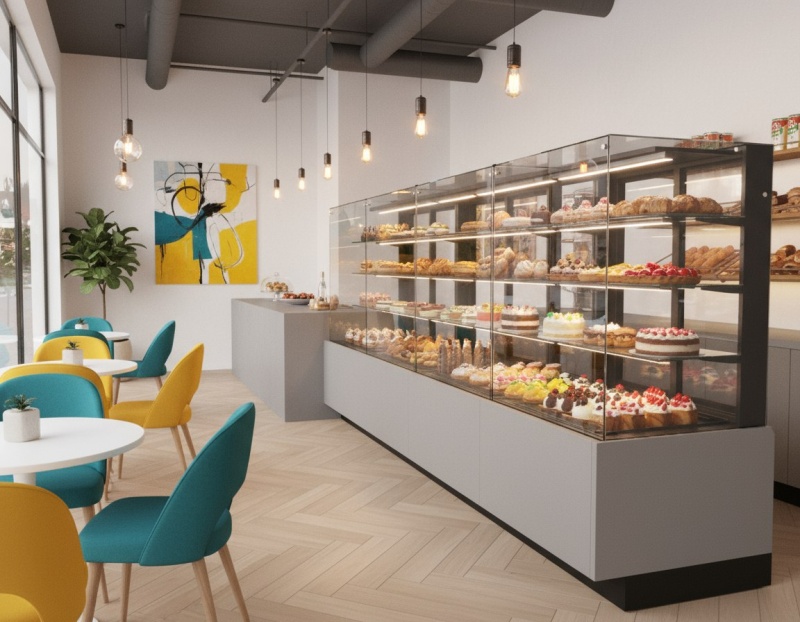 Для кофейни до 30 м² достаточно одной средней витрины. Проверьте эргономику: клиенту должно быть удобно разглядывать десерты, а персоналу быстро пополнять запасы.