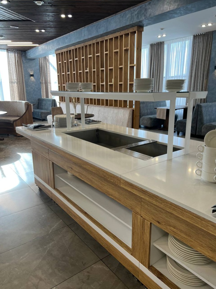 - Открытая шоу-кухня: Оснащена индукционными конфорками для безопасного и эффектного приготовления блюд на глазах у гостей.