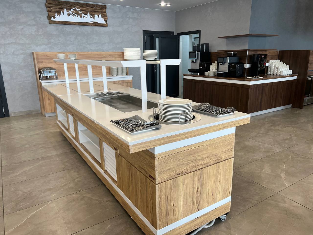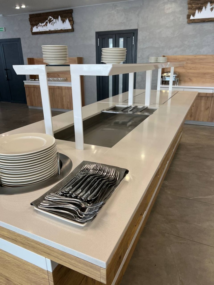 - Обеденный зал: оборудование премиум-класса модули шведского стола линии Filin от REFETTORIO - мармит первых блюд, мармит вторых блюд, охлаждаемая поверхность и холодильный прилавок, индукционные плиты НОВАЯ ЭНЕРГИЯ.